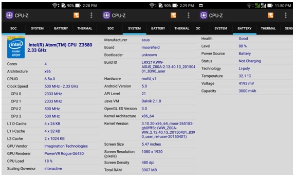 CPU-Z application summarizes that Intel Atom Z3580’s speed can be lowered to 500MHz to save battery and reduce processor temperature. CPU-Z also displays the average temperature of 3000mAH Lithium-Polymer battery is about 32-degree Celsius.