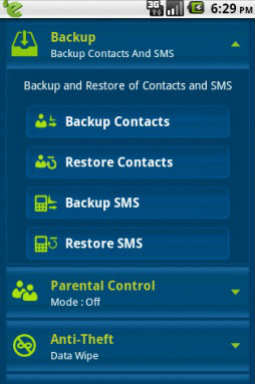 eScan Mobile Security enables us to backup all contacts and SMS on to the memory card and secures them in case of virus infections and mobile crashes. The backed up data can also be easily restored back to the device, whenever required. The contacts are saved in .vcf and SMS in .db extension format.