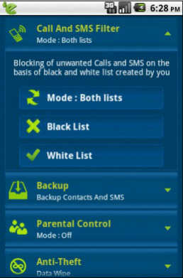 The Call and SMS filtering enables us to filter incoming calls and messages. Here we can specify numbers, phrases, words, and keywords that we want to white list and black list.