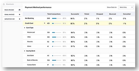 Further, to get a deeper understanding on how each of the payment methods are performing, the merchant can click on a specific payment method. By doing so, they will get the total no. of transactions, rate of success, failure etc. for each of the net banking options (HDFC, ICICI, Citibank etc.) Similarly, they can get issuing bank-wise insights for credit/debit cards as well. (Refer image below)