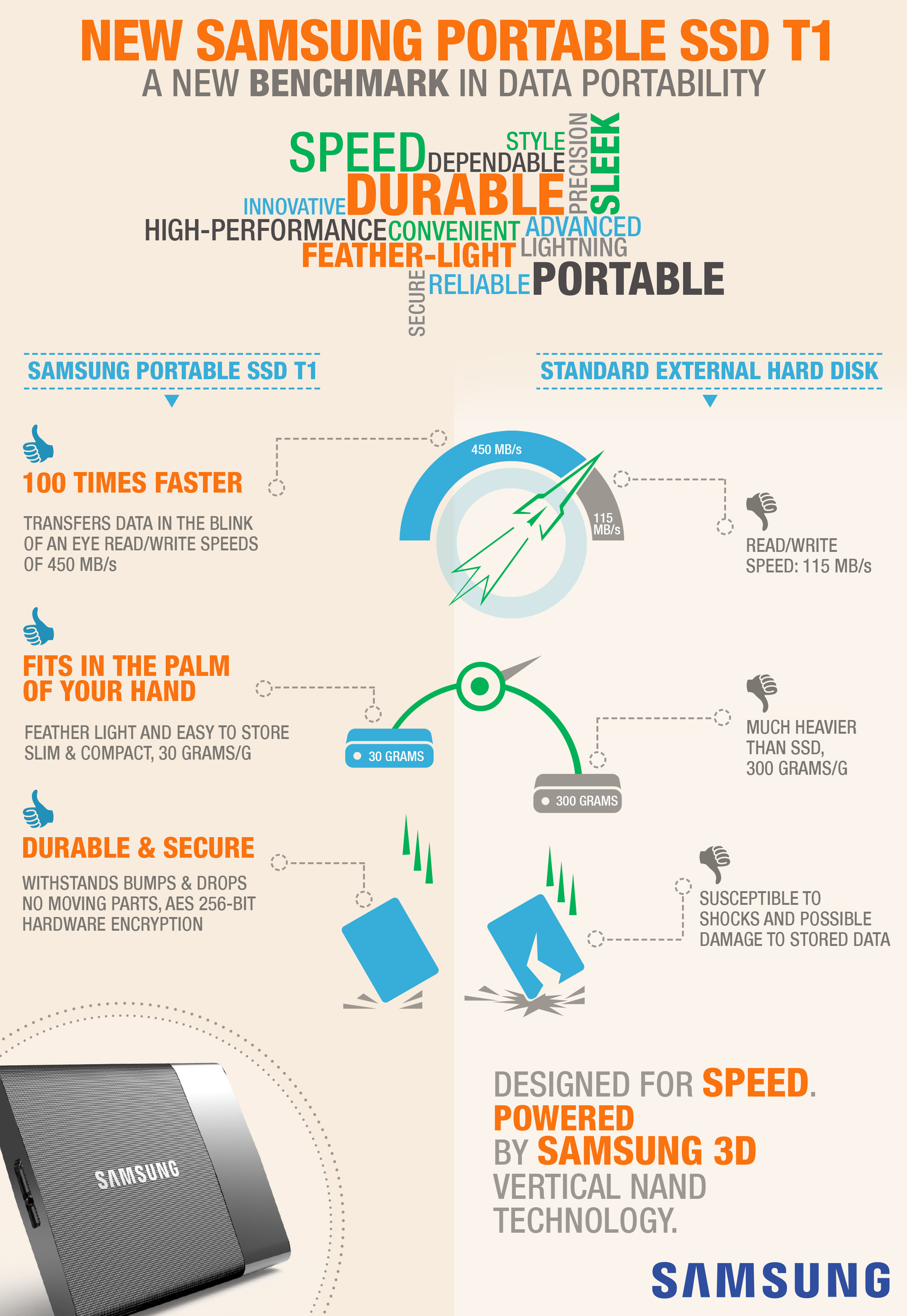 Powered by Samsung’s cutting-edge 3D Vertical NAND (V-NAND) technology, the Portable SSD T1 is a high-performance memory storage device that has recently been awarded at the 2015 International Consumer Electronics Show (CES).