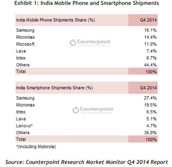 New Delhi, India, February 5, 2015: According to Counterpoint Research, In India, Samsung led the overall mobile phone and smartphone market during the quarter Q4 2014 (Oct-Dec) with a market share of 16.1% and 27.4% respectively. You can understand it via below chart: