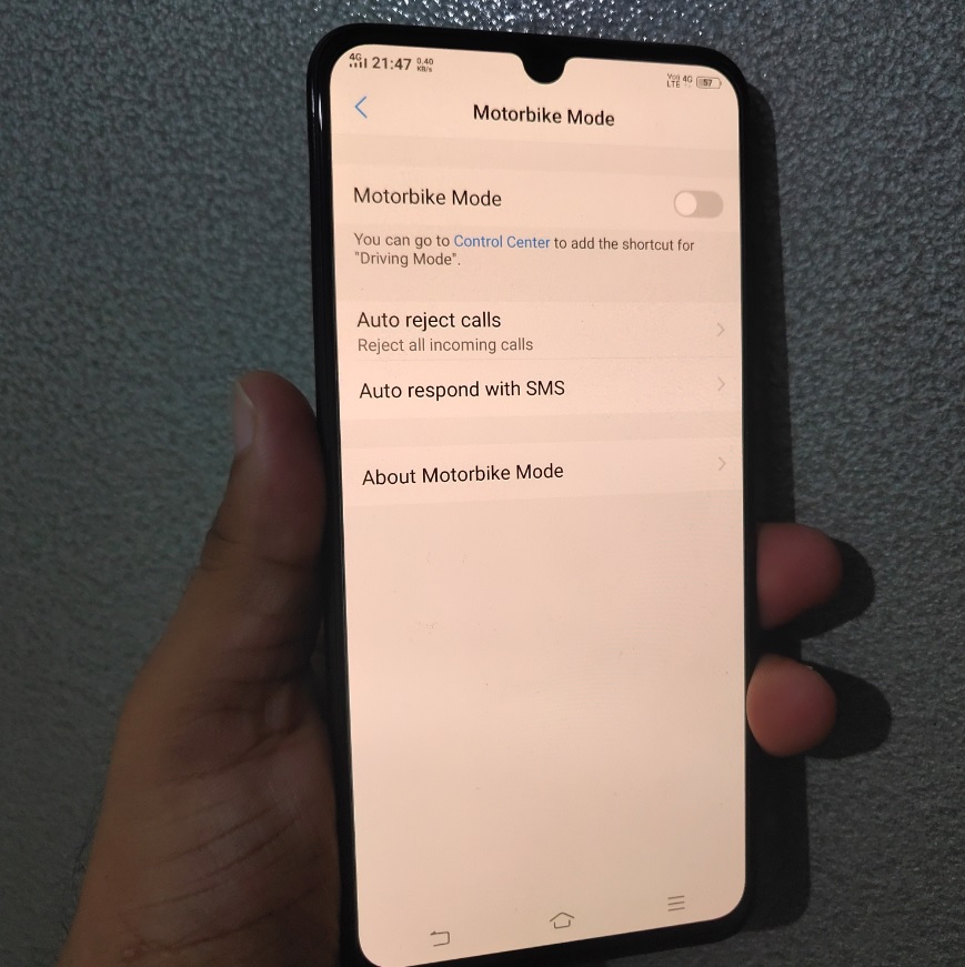 There is an additional feature included in the Settings and is called the MotorBike Mode. This feature helps by auto-rejecting calls with a text which informs the caller that user is driving. To use this option, open settings and tap on the Motorbike Mode. In the New Window, toggle the button adjacent to Motorbike Mode to enable that on your device. Once the option is enabled, the calls will be automatically rejected when the drive mode is on. There is an additional option where you can customize the text which is sent out when the phone auto-rejects calls.
