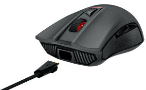 ROG Gladius comes with a 2-meter braided USB cable for desktop use and a regular 1-meter USB travel cable for use at LAN parties or internet cafes. A one-push release button detaches the cable from Gladius with a simple click. The micro USB port sits a few millimeters above the table surface and is angled at an incline to prevent the connector from dragging on the desk. Every Gladius mouse comes with a ROG carry pouch, two ROG logo stickers, and four smooth-glide mouse feet.