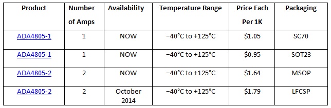 With exceptionally low offset-voltage drift of 1.5µV/°C maximum (0.2μV / 0C typical), the ADA4805 family offers eight times lower drift performance than competing high-speed (100MHz) amplifiers. The combination of superior ac and dc performance allow designers to enhance system sensitivity, dynamic range and overall system accuracy. The ADA4805-1/-2 amplifiers have a wide voltage range, supporting 3-V supplies, and in applications that require a wider dynamic range can also operate on supplies as high as +/-5V.