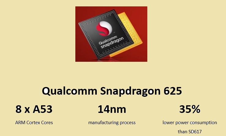 Processor: Qualcomm Snapdragon 625 Octo-core – 14nm 8×2.0GHz ARM Coretex A53