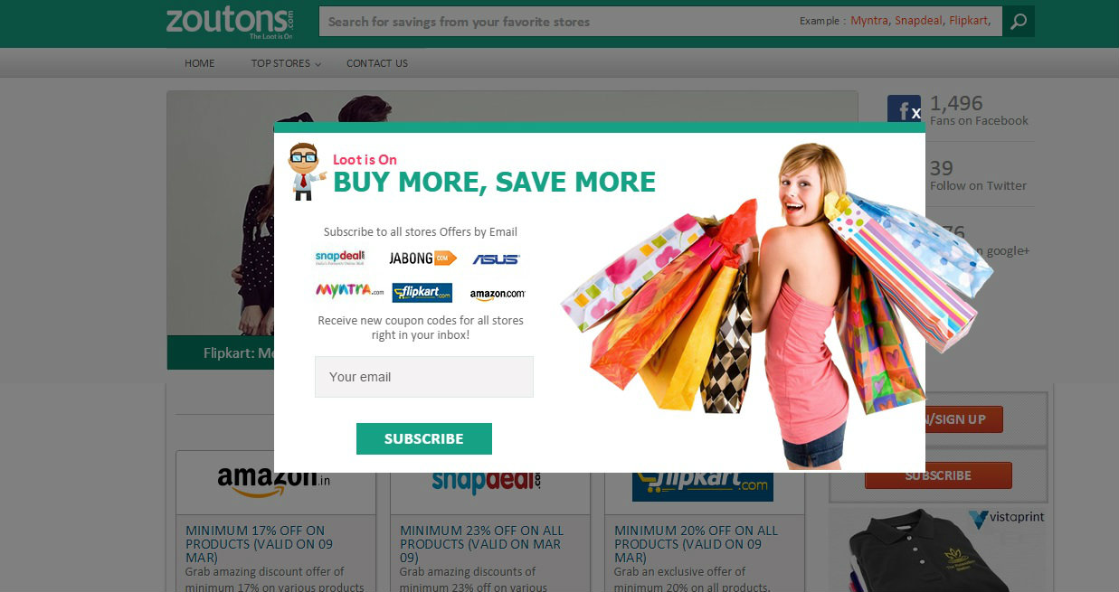 User can also make an account on it and subscribe it for more info on deals and coupons. Subscription of zoutons. com is too easy, you have to just click on subscribe icon, it is on right hand side on home page of zoutons. com, after subscription you will get all info related to coupans and deals in your e-mail inbox. By it, you are saving your time.