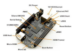 BeagleBone Black development platform, based on TI’s Sitara AM3358 processor, which features an ARM Cortex–A8 processor running at 1GHz and an onboard HDMI. Technical documents at http://www.element14.com/community/docs/DOC-54121